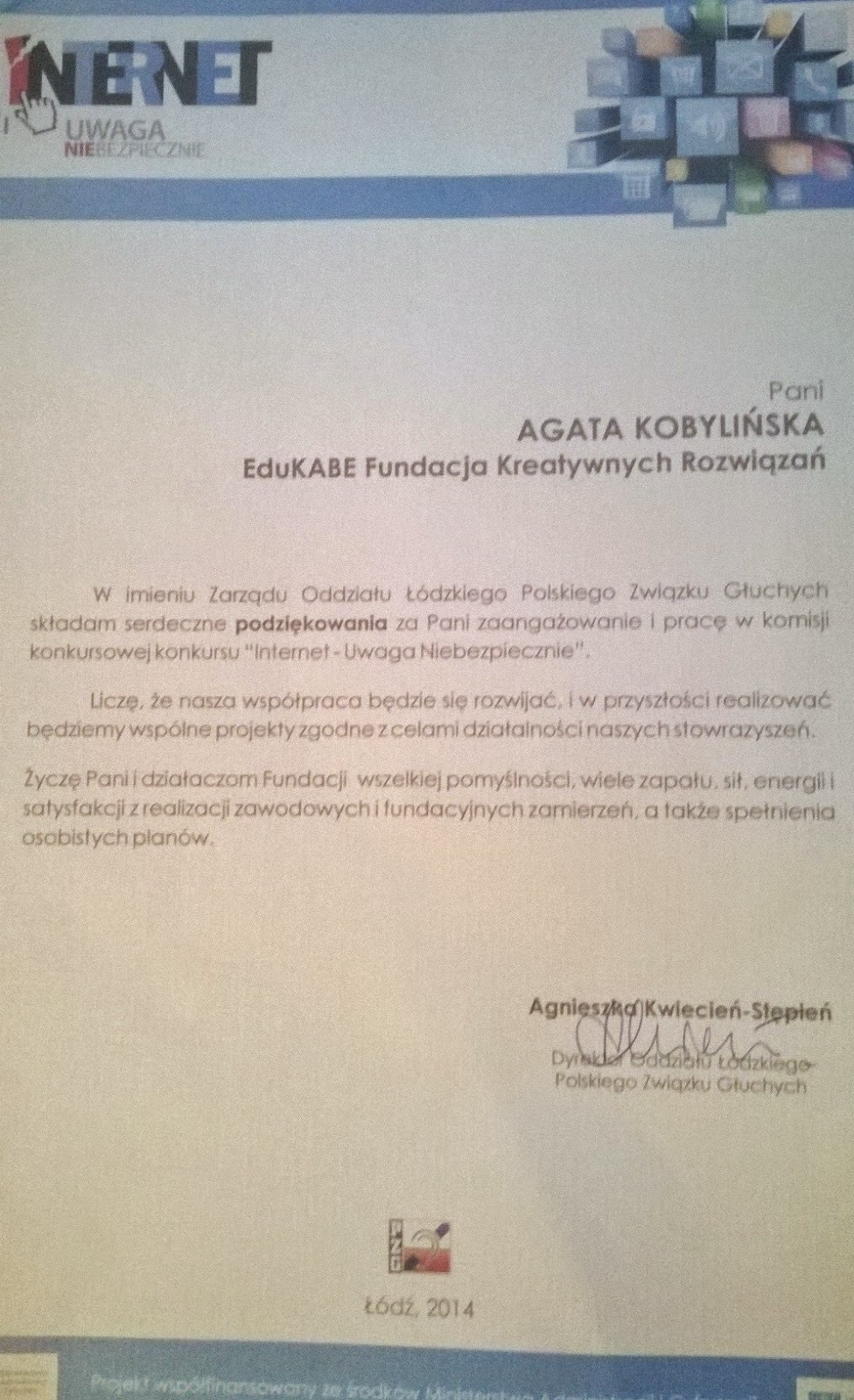 Zapraszamy do zapoznania się z wynikami konkursu organizowanego przez Polski Związek Głuchych Oddział Łódzki „„Internet –Uwaga Niebezpiecznie” i obejrzenia filmów konkursowych. Celem konkursu było minimalizowanie zagrożeń oraz bezpieczne zachowania w Internecie. Nasza Fundacja była zaangażowana w pracę komisji konkursowej. Niektóre filmy wywarły na nas ogromne wrażenie, ale wszystkie wywołały uznanie i szacunek za ogrom pracy włożony w przygotowanie filmów. GRATULUJEMY ZWYCIĘZCOM !!! Liczymy również na dalszą współpracę 🙂