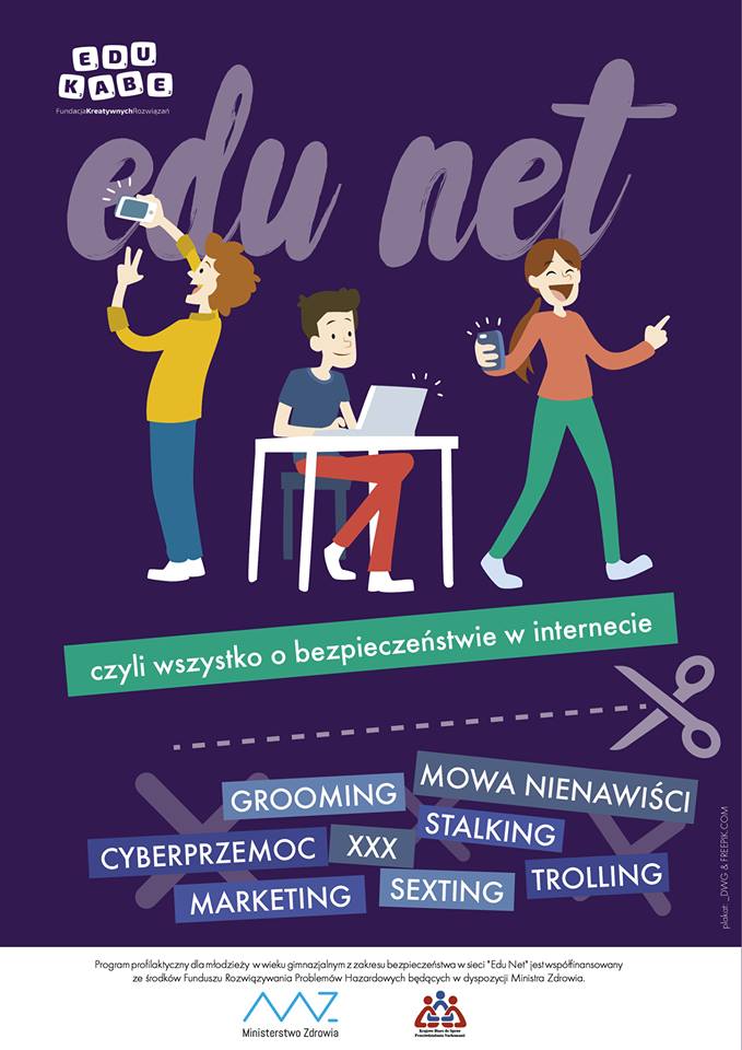 Projekt „Program profilaktyczny dla młodzieży w wieku gimnazjalnym z zakresu bezpieczeństwa w sieci „Edu Net” jest finansowany ze środków Funduszu Rozwiązywania Problemów Hazardowych pozostających w dyspozycji Ministra Zdrowia.