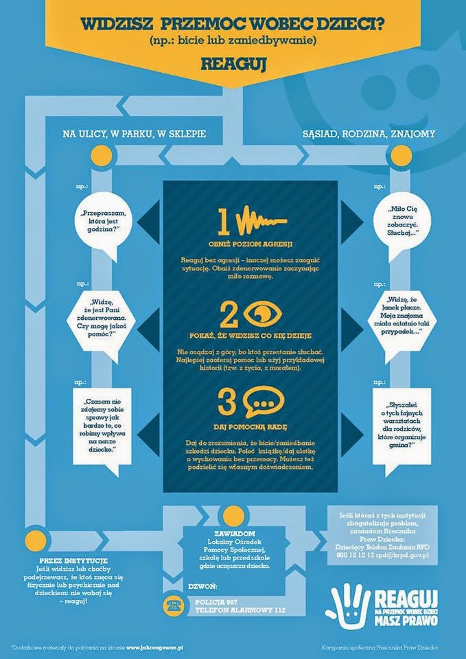 Reaguj na przemoc wobec dzieci !!! Kampania społeczna Rzecznika Praw Dziecka REAGUJ. MASZ PRAWO. Świadkiem przemocy możesz być wszędzie – na ulicy, po sąsiedzku, w pracy. REAGUJ.MASZ PRAWO. Twoja reakcja może uratować zdrowie, a nawet życie dziecka. Nawigacja wpisu 🠐 EduKABE w PREMD!!Skrypty reakcji przygotowane w ramach kampanii społecznej Rzecznika Praw Dziecka „Reaguj. Masz prawo” 🠒