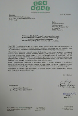 Fundacja EduKABE wysłała dzisiaj oficjalne stanowisko w sprawie artykułu profesora Zbigniewa Stawrowskiego opublikowanego w piątkowym dodatku do „Rzeczpospolitej” „Plus i minus” z dnia 16.09.2016 r. Nasze stanowisko zostało przesłane do Redaktora naczelnego dziennika „Rzeczpospolita”oraz do wiadomości Rzecznika Praw Dziecka oraz Rzecznika Praw Obywatelskich.